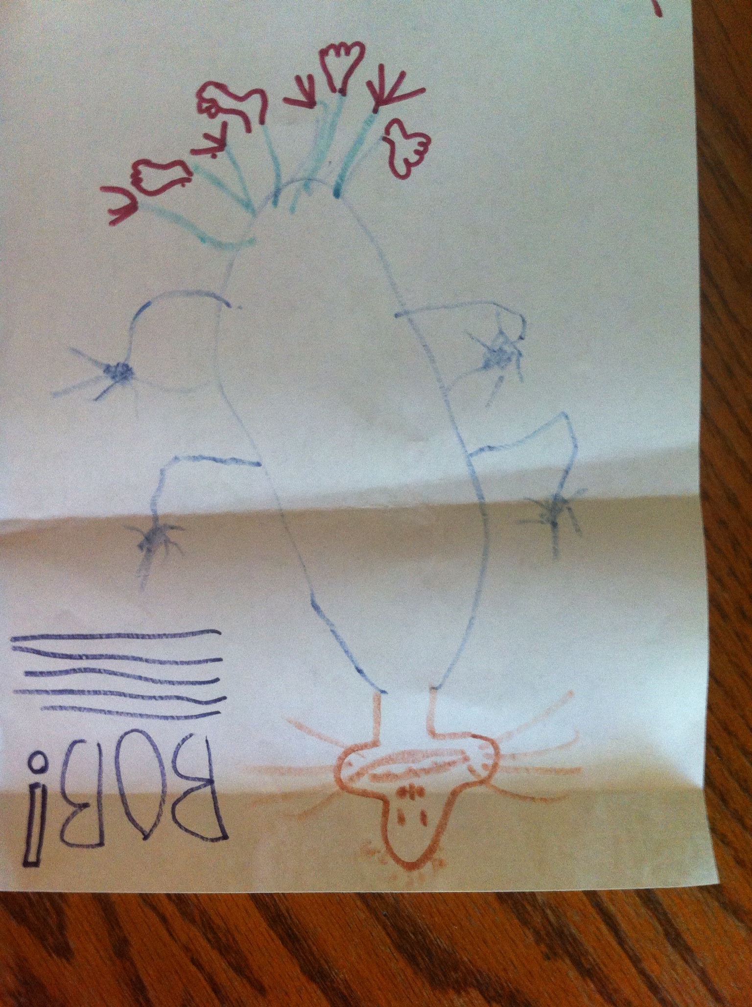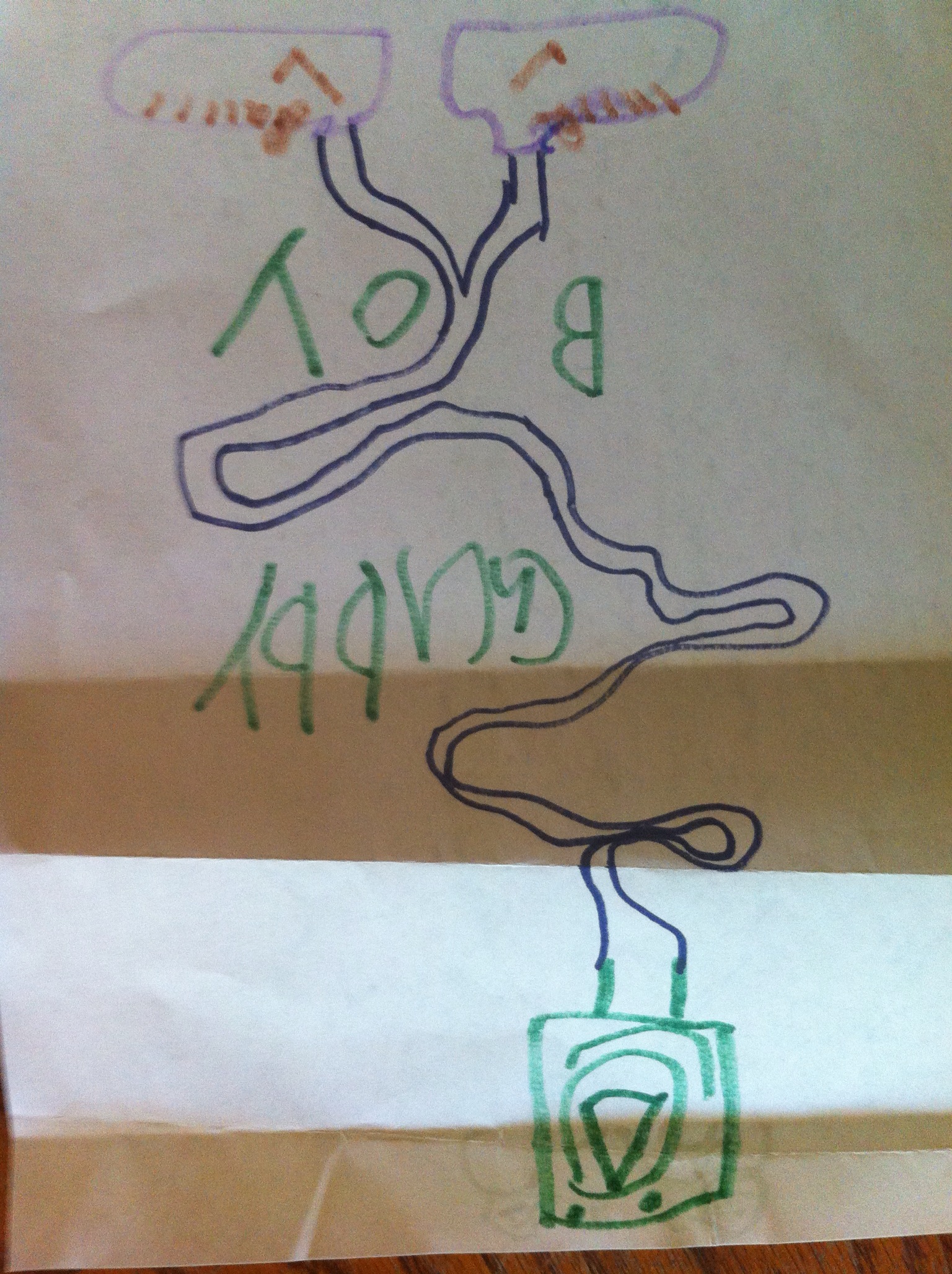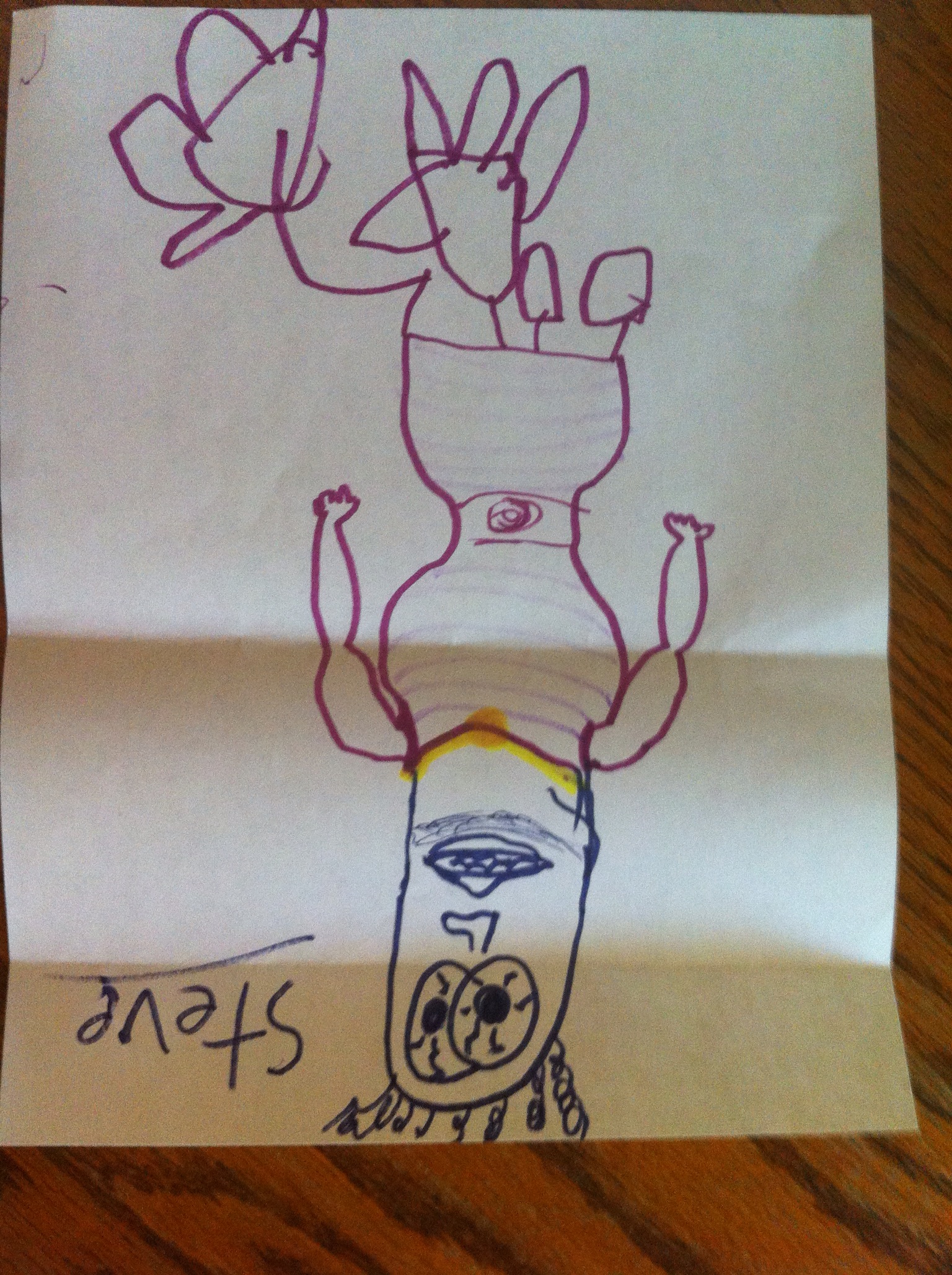 ART SCRAPBOOK … easy to make, and a great way to store that refrigerator art. My mother-in-law just showed me a book done by my husband and it’s very precious (*manly wince*). I highly recommend something along these lines. Captions to say who/what was drawn might help when they’re older too.