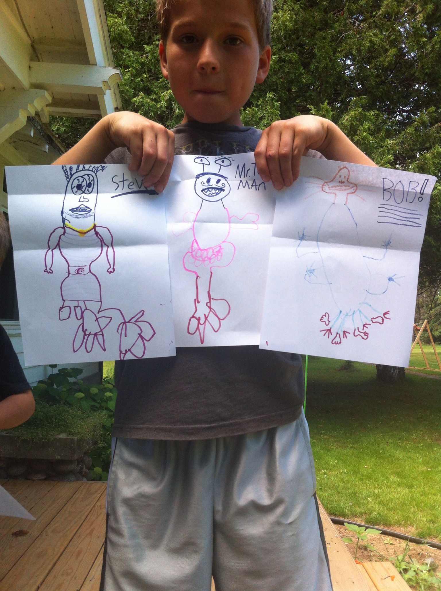 MATCH-UP BOOKS are always a hit. We also played a game when I was little where everyone would draw a head and fold the paper down so only the neck stuck out. The papers got passed around and everyone drew a body, and folded their paper down with two legs sticking out. Pass the paper, draw the feet, and pass again or not before you unfold your creations. Lots of quiet entertainment followed by truly funny pictures – marvelous!
